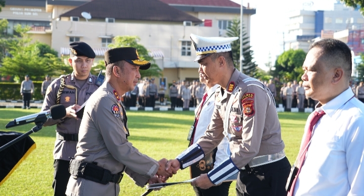 Kapolda Sumatera Selatan Irjen Pol Dr. Sandi Nugroho, S.I.K., S.H., M.Hum. memimpin Apel Pemberian Penghargaan kepada personel berprestasi di Lapangan Apel Mapolda Sumsel, Senin (13/4/2026) pukul 07.00 WIB. Sebanyak 48 personel dari berbagai satuan menerima penghargaan atas kinerja luar biasa di bidang penegakan hukum, pengabdian internasional, pelayanan kemanusiaan, hingga prestasi olahraga.