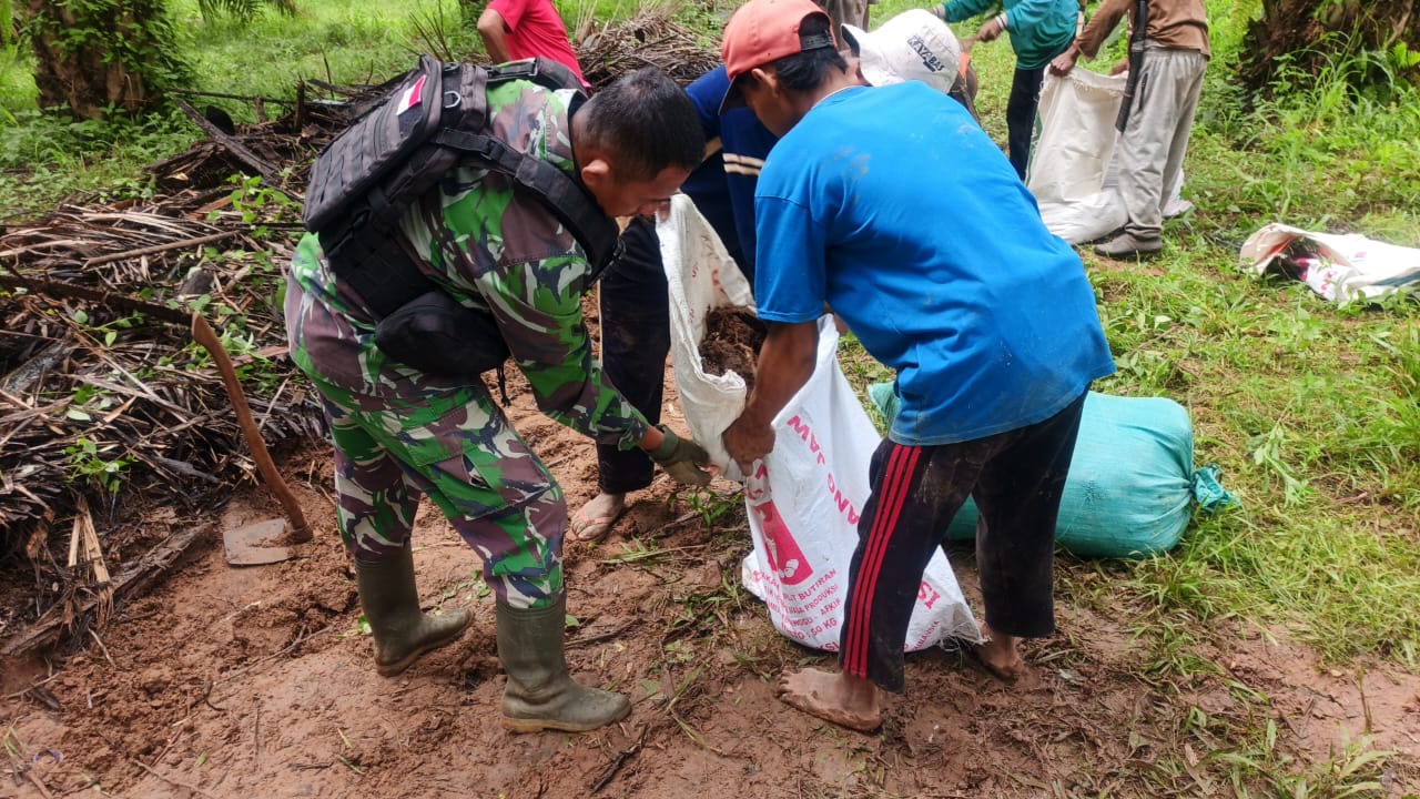 Babinsa Koramil 429-03/Marga Tiga Kodim 0429/Lamtim Sertu Edi Susianto bersama warga Desa Gedung Wani melaksanakan gotong-royong penimbunan jalan longsor di tepian sungai Way Sekampung akibat curah hujan, Selasa (24/02/2026).