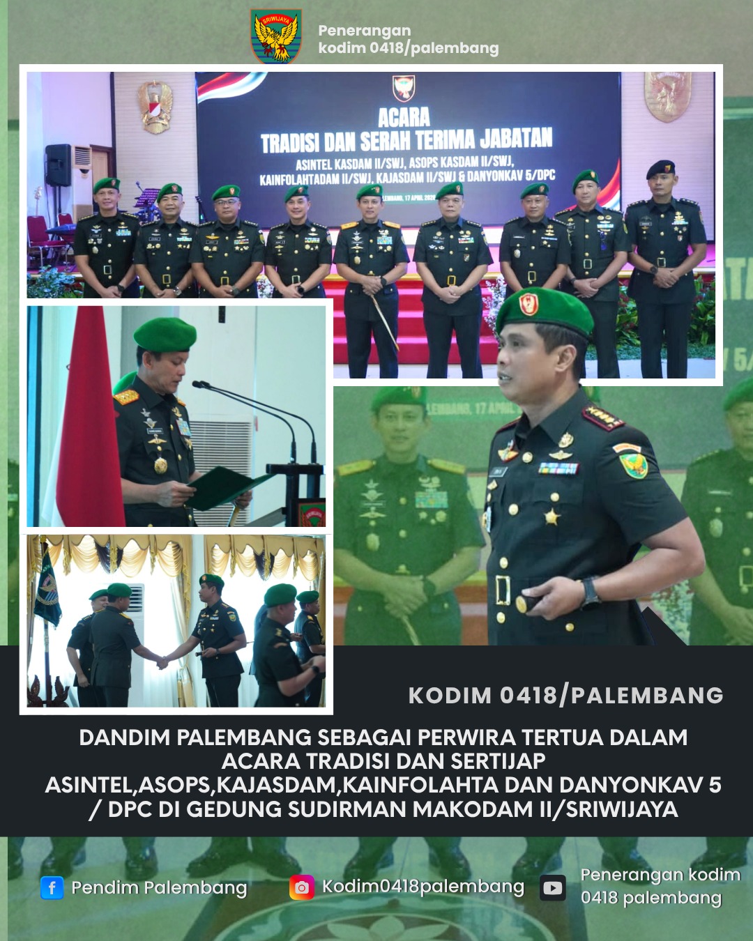 Dandim 0418/Palembang,Kolonel Arh Erik Novianto,S.sos turut hadir sebagai perwira tertua dalam kegiatan tradisi dan serah terima jabatan (sertijab) sejumlah pejabat di lingkungan Kodam II/Sriwijaya.