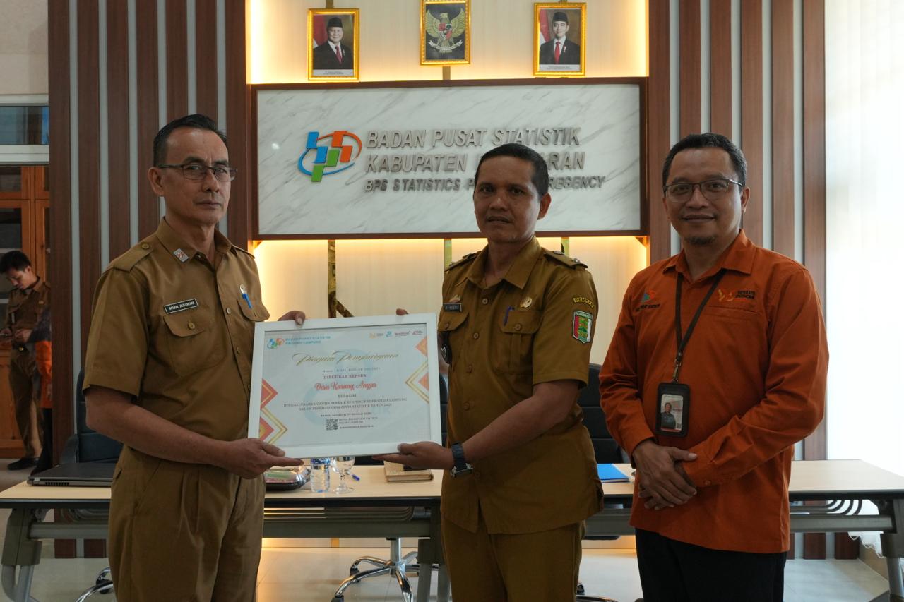 Pada kesempatan yang sama, BPS Pesawaran memberi apresiasi kepada *Desa Karang Anyar* yang meraih predikat Desa Cantik Terbaik II tingkat Provinsi Lampung 2025. BPS juga menyerahkan cinderamata kepada desa-desa berkelanjutan atas komitmennya dalam pengelolaan data. (Indra).