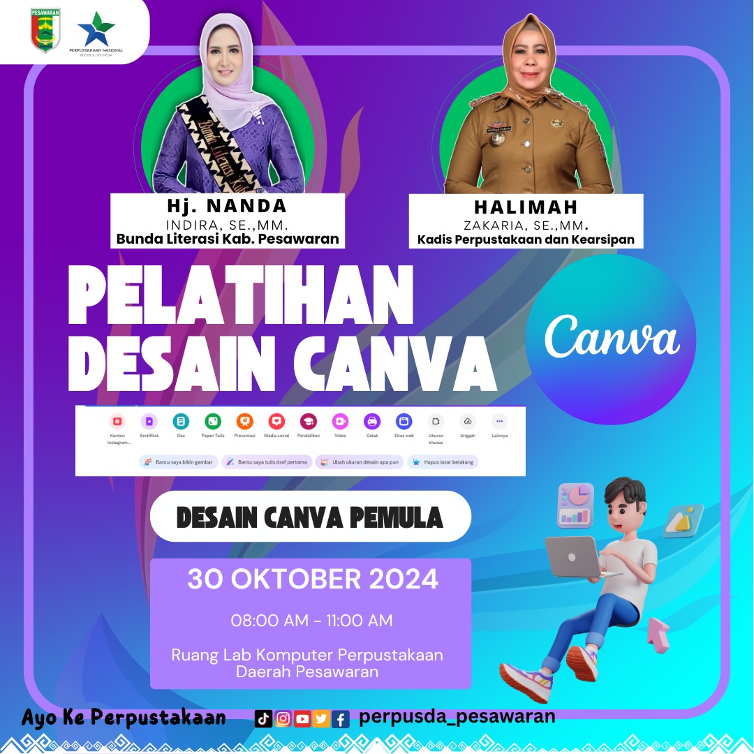 Dinas perpustakaan dan kearsipan Kabupaten Pesawaran menggelar pelatihan desain Canva bagi pemula, Rabu, (30/10/2024) di Ruang Lab Komputer Perpustakaan Daerah kabupaten setempat.