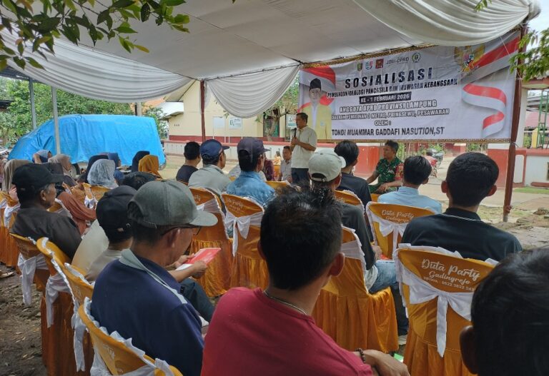 Anggota DPRD Provinsi Lampung, Tondi Muammar Gaddafi Nasution, menegaskan bahwa Pancasila tidak boleh berhenti sebagai slogan atau hafalan semata, melainkan harus benar-benar hidup dan terwujud dalam perilaku masyarakat sehari-hari. Penegasan itu disampaikan saat ia menggelar Sosialisasi Pembinaan Ideologi Pancasila dan Wawasan Kebangsaan di Pekon Gadingrejo, Kecamatan Gadingrejo, Kabupaten Pringsewu, Minggu (8/2/2026).