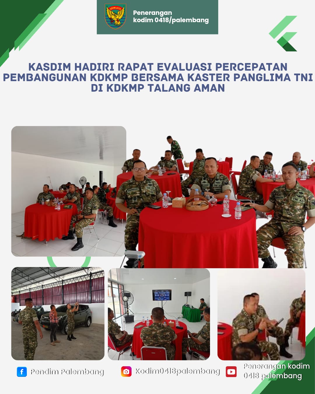Dalam kesempatan tersebut, Dandim 0418/Palembang Kolonel Arh Erik Novianto, S.Sos melalui Kasdim menyampaikan bahwa kegiatan evaluasi ini merupakan langkah strategis dalam memastikan target percepatan pembangunan KDKMP berjalan optimal.