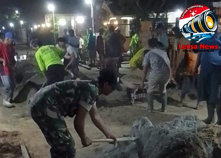 Dengan penuh ketulusan, Kopda Agus Purwadi bersama warga bahu-membahu menurunkan turut mengaduk semen. Meski malam hari, suasana tetap penuh keakraban dan kebersamaan.