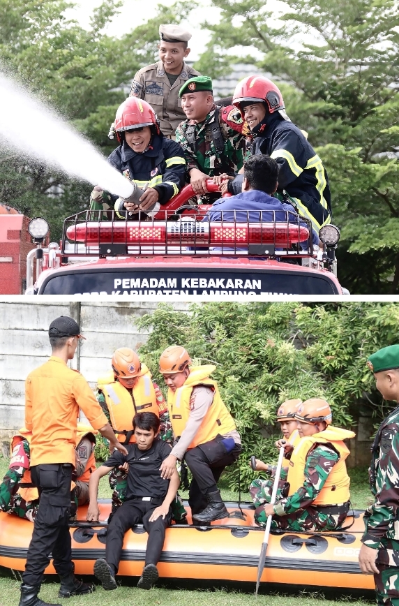 Usai apel, sinergi TNI-Polri bersama instansi terkait melanjutkan kegiatan latihan simulasi penyelamatan korban tenggelam baik yang masih hidup maupun sudah meninggal serta pelatihan penanganan musibah kebakaran.(pendim0429).