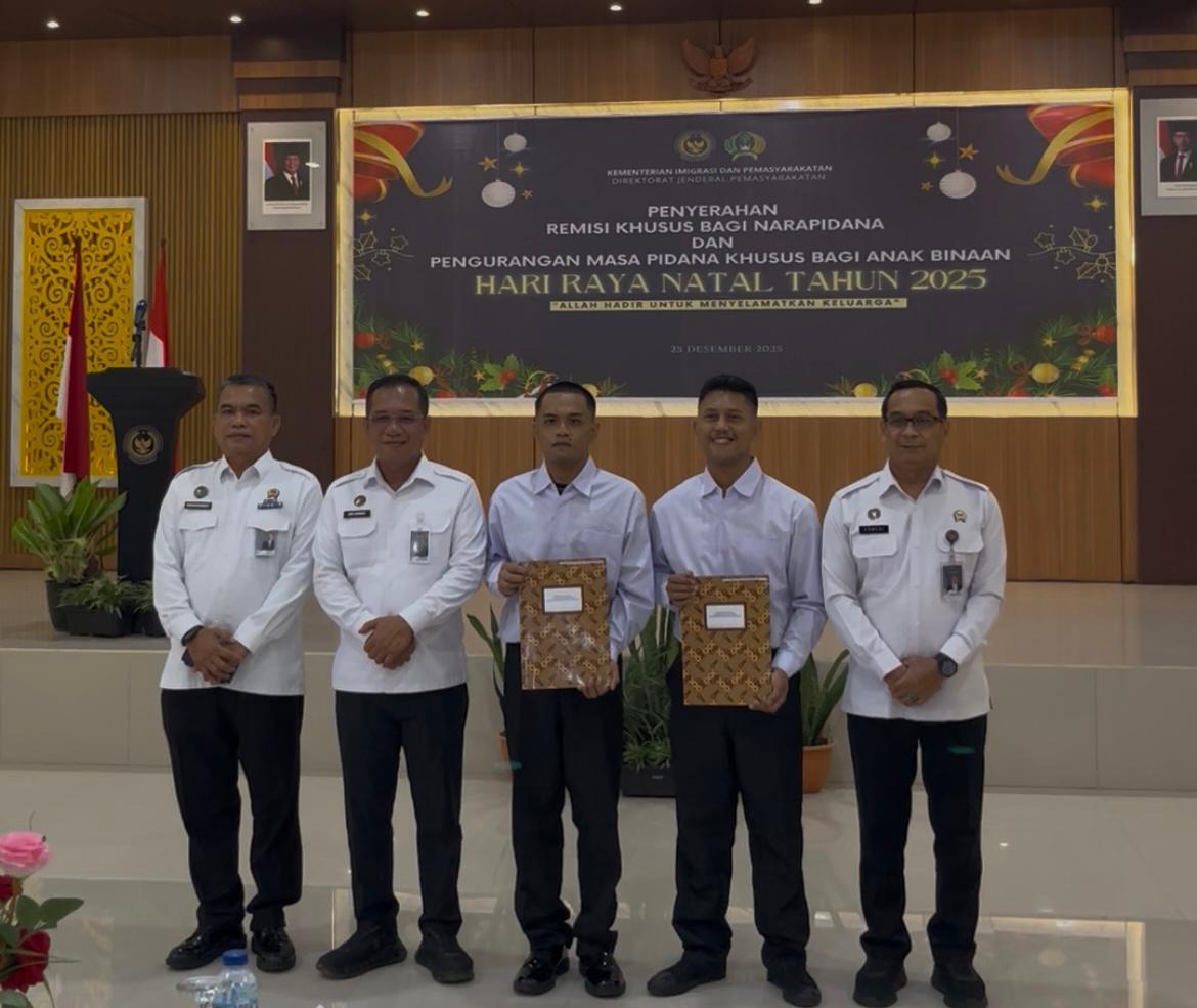 Lembaga Pemasyarakatan (Lapas) Kelas I Palembang melaksanakan pemberian Remisi Khusus Hari Raya Natal Tahun 2025 kepada warga binaan pemasyarakatan di Aula Utama Lapas Palembang, Kamis (25/12). Sebanyak 11 orang warga binaan yang beragama Kristen menerima Remisi Khusus Natal dengan besaran pengurangan masa pidana yang bervariasi. Pemberian remisi ini merupakan bentuk pemenuhan hak warga binaan sesuai dengan ketentuan peraturan perundang-undangan yang berlaku.
