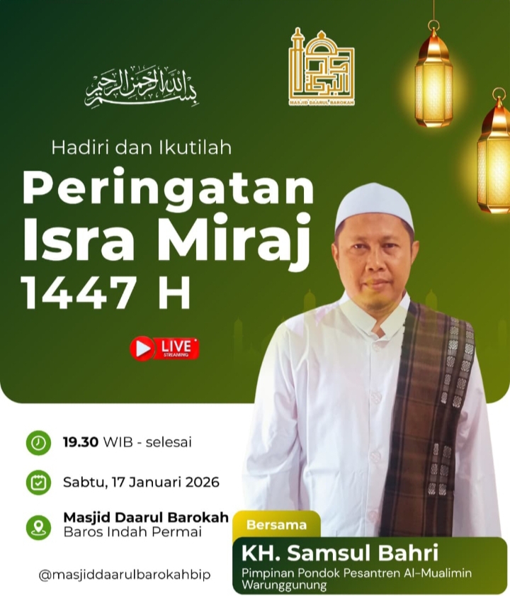 Dalam rangka memperingati peristiwa agung Isra Mi’raj Nabi Muhammad SAW, DKM Masjid Daarul Barokah perumahan BIP akan menggelar kegiatan Peringatan Isra Mi’raj 1447 Hijriah pada Sabtu malam, 17 Januari 2026.