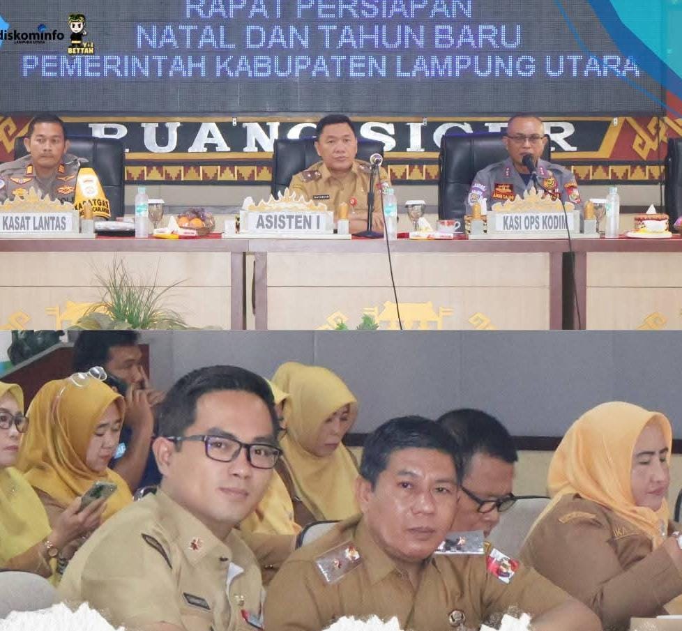Pemerintah Kabupaten Lampung Utara menggelar rapat koordinasi persiapan pengamanan Natal dan Tahun Baru (Nataru) di Ruang Siger Setdakab, Senin. Rapat dipimpin oleh Asisten I, Drs. Mat Soleh, M.Pd, mewakili Bupati Lampung Utara, dan dihadiri Kasat Lantas Polres Lampung Utara, Kepala Dinas Perhubungan Anom Sauni, S.H., M.M., beserta jajaran kepala dinas terkait.