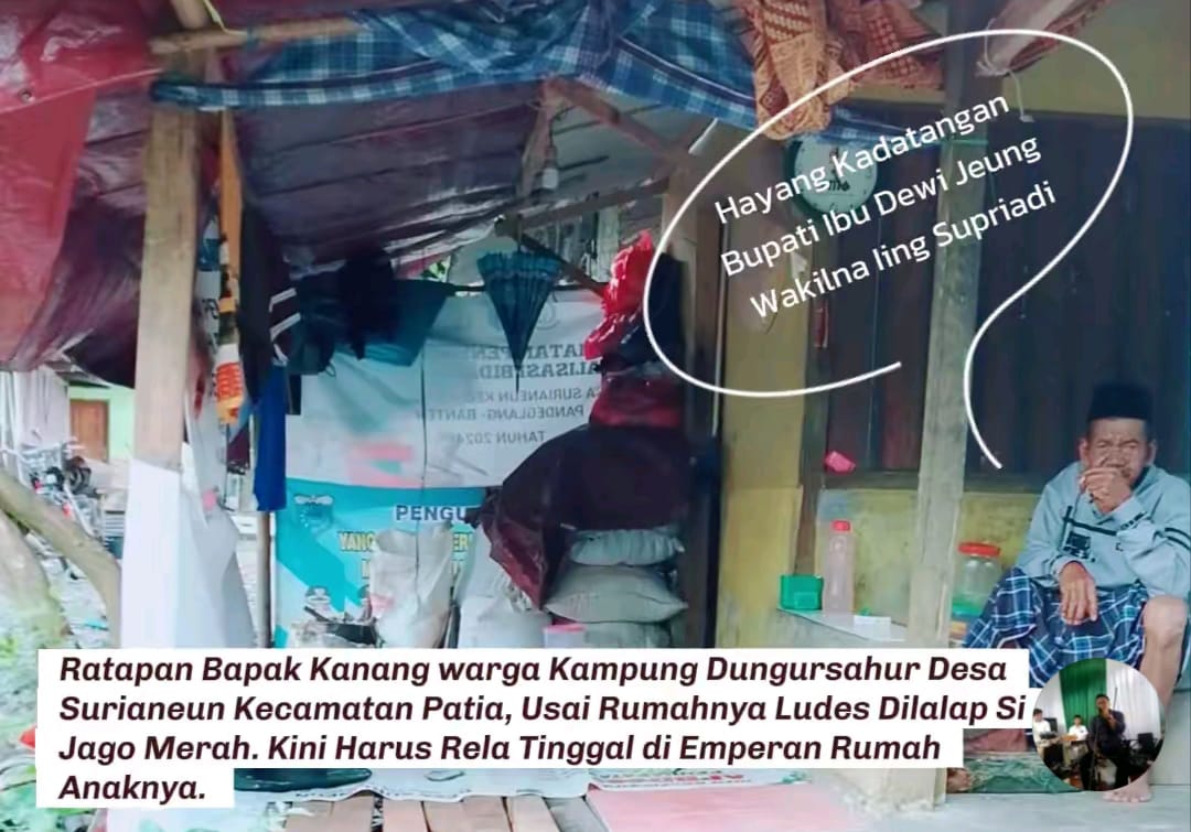 Sepasang suami istri lansia, Bapak Kanang (61) dan Ibu Arni (58), harus tinggal di emperan setelah rumah mereka di Kampung Dungushaur. RT/RW 018-004 Desa Surianeun, Kecamatan Patia, Kabupaten Pandeglang, ludes terbakar api pada Bulan Suci Ramadhan 2026 lalu.