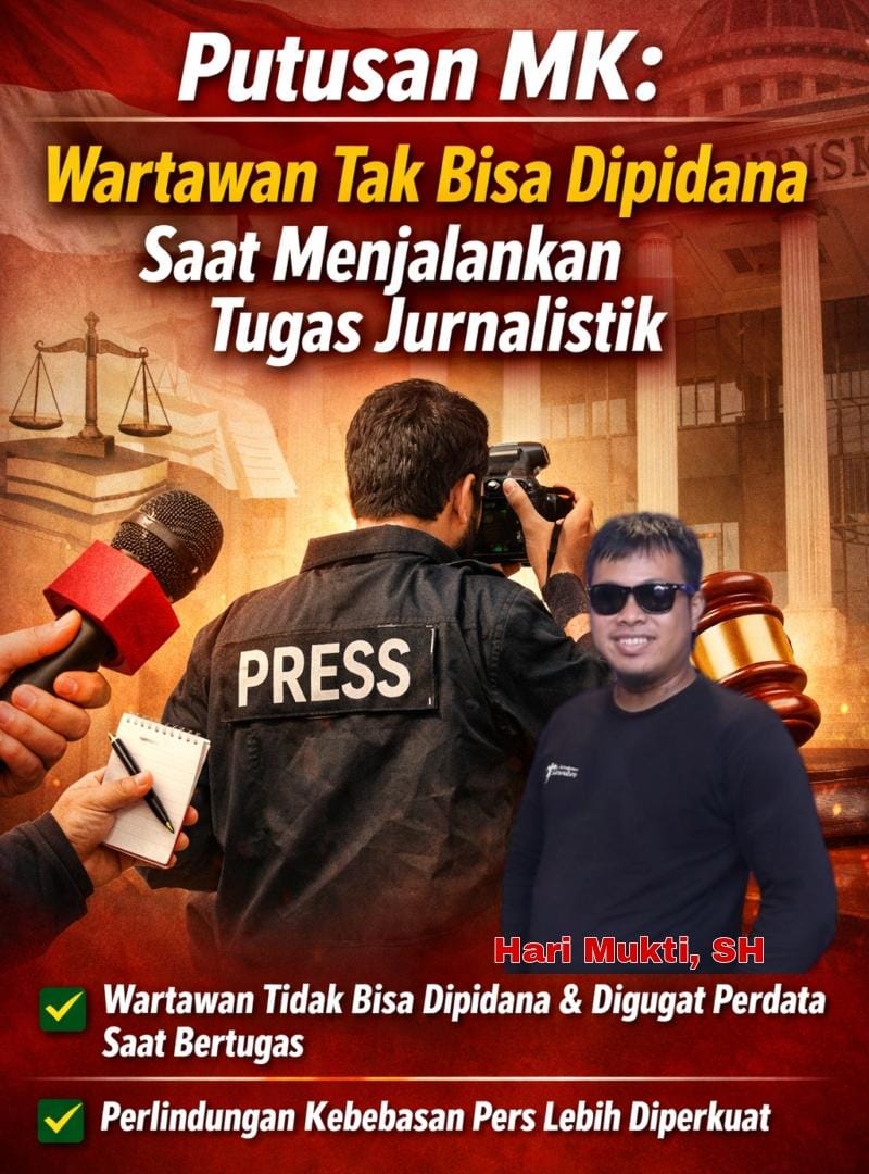 Mahkamah Konstitusi (MK) memutuskan wartawan tidak dapat langsung dituntut pidana atas karya jurnalistiknya. Putusan ini merupakan tanggapan MK dalam uji materiil terhadap Pasal 8 Undang-Undang Nomor 40 Tahun 1999 tentang Pers (UU Pers) yang diajukan Ikatan Wartawan Hukum (IWAKUM).