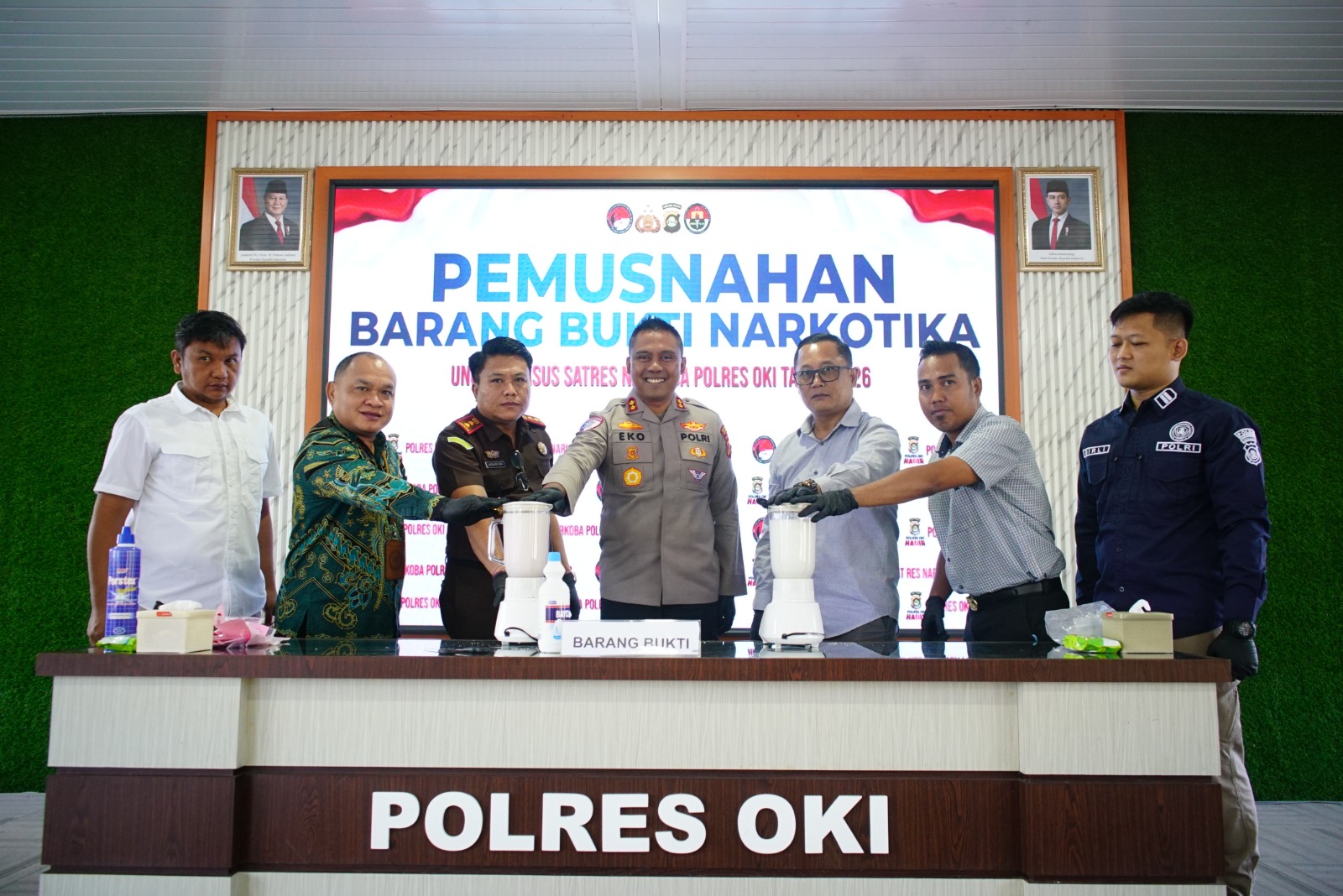 Polda Sumatera Selatan melalui Polres Ogan Komering Ilir (OKI) kembali menunjukkan komitmen tegas dalam memberantas peredaran gelap narkotika. Satuan Reserse Narkoba Polres OKI melaksanakan pemusnahan barang bukti narkotika jenis sabu seberat 927 gram dalam konferensi pers yang digelar di Aula SAR Mapolres OKI, Kamis (16/4/2026).
