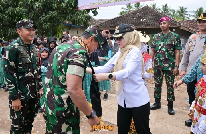Bupati Pesawaran, Hj. Nanda Indira, mendampingi Wakil Asisten Teritorial (Waaster) Panglima TNI, Brigjen TNI (Mar) Bambang Hadi Suseno, meninjau kegiatan TNI Manunggal Membangun Desa (TMMD) Ke-127 di Desa Tanjung Rejo, Kecamatan Way Khilau, Rabu (04/03/2026).